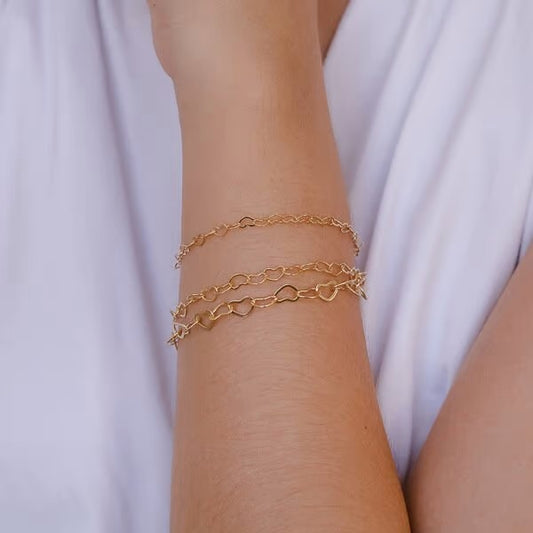 Pulseira Tripla Banhada a Ouro 18k, com Elos de Corações Vazados Lisos