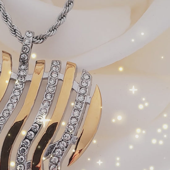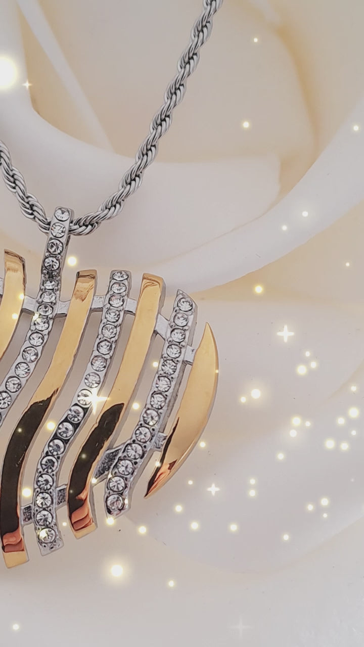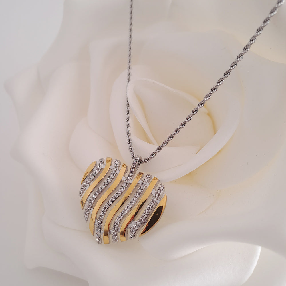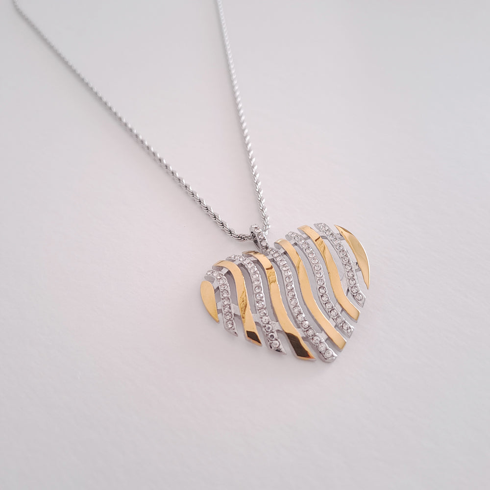 Dê um toque de romantismo e elegância ao seu look com este colar em aço bicolor, com pendente em forma de coração. As linhas onduladas com apontamentos de brilho captam a luz com sofisticação e tornam esta peça irresistivelmente luminosa.