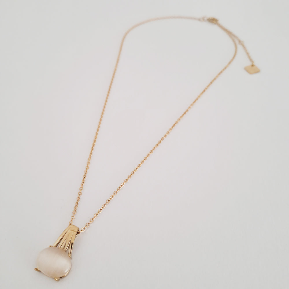Este colar em aço dourado destaca-se pelo pendente em pérola, símbolo de elegância intemporal. A estrutura dourada envolve a pérola com suavidade, criando uma peça romântica e versátil.